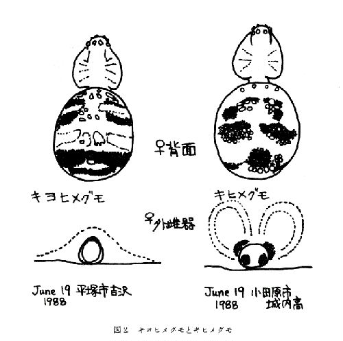 キヒメグモの暗色型はキヨヒメグモと称されていたクモにそっくりであり,これまでキヨヒメグモと同定されていたクモはすべて再検討の必要が生じてきた.なぜなら,本調査以前にキヒメグモの暗色型は知られていなかったし,卵のうの形や網の形は両種で,まったく同じだからである. とはいえ,キヒメグモとは別種のキヨヒメグモが生息していることも確実であるらしい.私達の調査でもキヨヒメグモと思われる個体が採集されており(採集地は神奈川県平塚市吉沢),そのメスの外部生殖器 Epigynumはキヒメグモの暗色型とは異なっているからである(図2.池田原図).ただしキヨヒメグモのEpigynumはこれまでどこにも報告されておらず,過去の同定は直感的に色彩や斑紋に頼っていたところも多いため,標本の残っていない記録のキヨヒメグモがキヒメグモの誤りの可能性があることに変わりはない.このような事情からすると,キヒメグモがAchaearanea属であれば,キヨヒメグモも同属であろう.