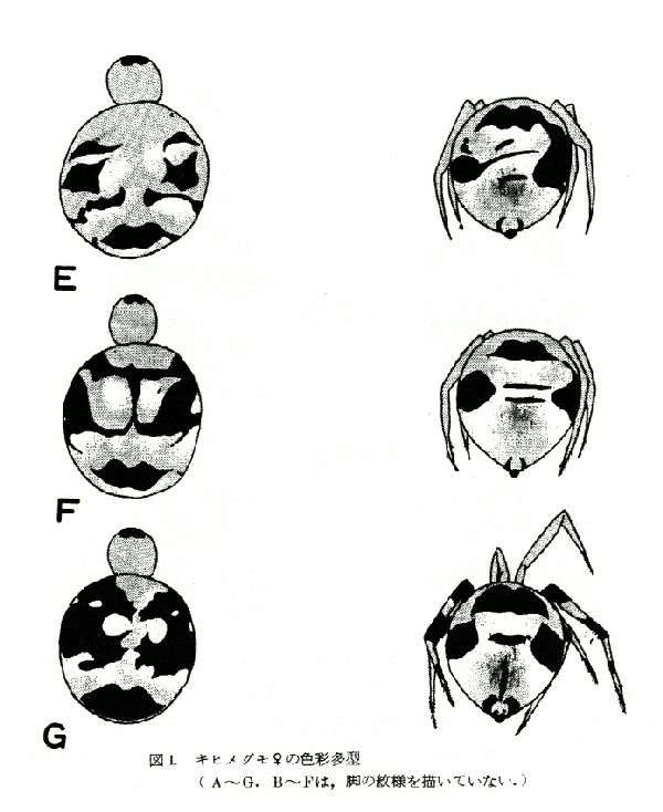 キヒメグモの色彩多型 Colour Polymorphism in Achaearanea asiatica 久保寺みか1)・池田博明2) Mika Kubotera and Hiroyoshi Ikeda 1)青山学院大学理学部物理学科 2)神奈川県立小田原城内高等学校 はじめに 小田原城内高等学校敷地内に初めてキヒメグモ Achaearanea asiaticaの集団を見つけた時,私達は最初にそれをキヨヒメグモ Theridion sp.だと思ってしまった. キヨヒメグモは岸田久吉氏が和名だけを残したまま,記載しなかったため,言い伝えで同定されてきたいわば正体不明のクモであった.言い伝えによると,キヨヒメグモはキヒメグモ程度の大きさで,茶褐色の地色に黒色斑のある腹部を持つクモである.ところどころに白斑もある.不規則網にはヒメグモの様なシ−ト網はない.不規則網内に数個のしずく型の卵のうを吊すことがある. これらの特徴を持ったクモを8月に城内高校内で見たのだから,まさかそれがキヒメグモの方だったとは夢にも思わなかったのである.なぜならキヒメグモは「早春に成体」が採集されるクモだというし,斑紋も赤褐色の地色に三点の黒色斑があるだけだというのだから(松本,1973:八木沼,1986).しかし,調べていくうちに明らかにキヒメグモの特徴を持つ個体も見つかるようになり,ついにはすべてがキヒメグモであることがわかったのである. 実際には,キヒメグモは早春と挽夏に発生する色彩多型種であった.色彩は典型的なキヒメグモ型(黒色斑の少ない,明色型)から中間的な段階のものを経てキヨヒメグモ型(黒色斑の多い,暗色型)までが生息しているのである. 本調査は池田の指導で,久保寺が城内高校在学中の1986年と1987年の夏休みに行ったものである.キヒメグモの調査地はすべて神奈川県小田原市の小田原城内高等学校敷地内である.調査結果は当該年の東京蜘蛛談話会の合同例会で口頭発表している.稲葉茂代氏(現所属神奈川県立秦野高等学校)は調査に協力してくださった.また吉田哉氏(山形県山形市立第四中学校教諭)にはキヒメグモのオスを同定していただいた. 1.キヒメグモの色彩多型 1987年に城内高校で見られたキヒメグモのメスの色彩変異の例を図1に示した(久保寺原図).明色型から暗色型まで7型を示したが,区分は便宜的なものである.B〜Fまでの脚の色彩変異は記録していない.連続的に変異していることがわかる.オスはキヒメグモ型のもの(A)だけしか生息していない.このようなメスに見られる連続的な変異はスエ−デンのサラグモの一種 Pityohyphantes phrygianusでも知られている.オスには変異がないことも同様である.このサラグモには脚にも背面に対応した色彩変異がある.したがって,キヒメグモでも脚に色彩変異があることは予想される.