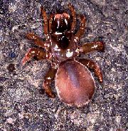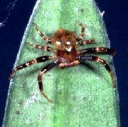 ![]() 第10問 ハタケグモは他のクモとちがった特徴がある.さて、体のどの部分に特徴があるのか? What's character of this spider? |